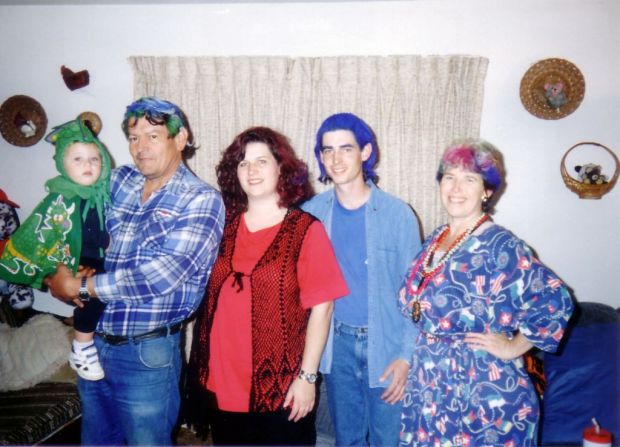 In October I stopped by the local DMV to apply for a commercial drivers license permit. I had to take a couple of the tests twice but I finally passed. Also this month I went to an Octoberfest in Modesto with my parents. On Halloween I painted my hair blue in the morning and went to work. The rest of my family also painted their hair and we took pictures to remember how great we all looked. I thought I looked pretty cool with blue hair. Maybe I'll get it dyed someday. Naw.