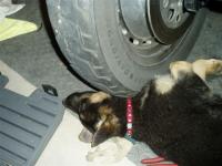 think she\'s helping my dad work on the truck here....